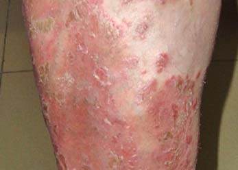 泛发性脓疱型牛皮癣发病快,可在几日或一周脓疱泛发全身,常常伴有发烧、全身不适、乏力、关节肿胀等症状。泛发性脓疱型牛皮癣患者皮损处的红斑出现大量针头或绿豆大小的无菌性小脓疱,逐渐脓疱扩散或融合,结成大片,散布全身。融合后的脓疱形成脓糊。皱襞部常出现擦烂、结痂。如泛发性脓疱型牛皮癣总是反复发作,很容易引发红皮病型牛皮癣,所以,泛发性脓疱型牛皮癣患者一但确诊,必须及时治疗。